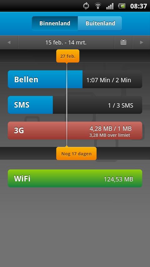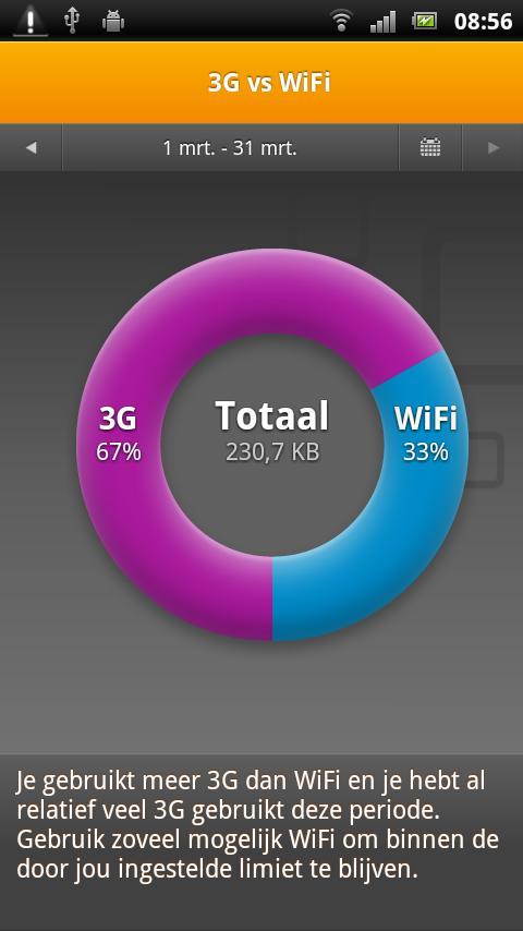 - Salve no uso de dados móveis com a função '3G versus Wi-Fi'. Aqui você vê uma comparação entre seus dados móveis e consumo de Wi-Fi, com conselhos sobre como você pode permanecer dentro do seu limite de MB.