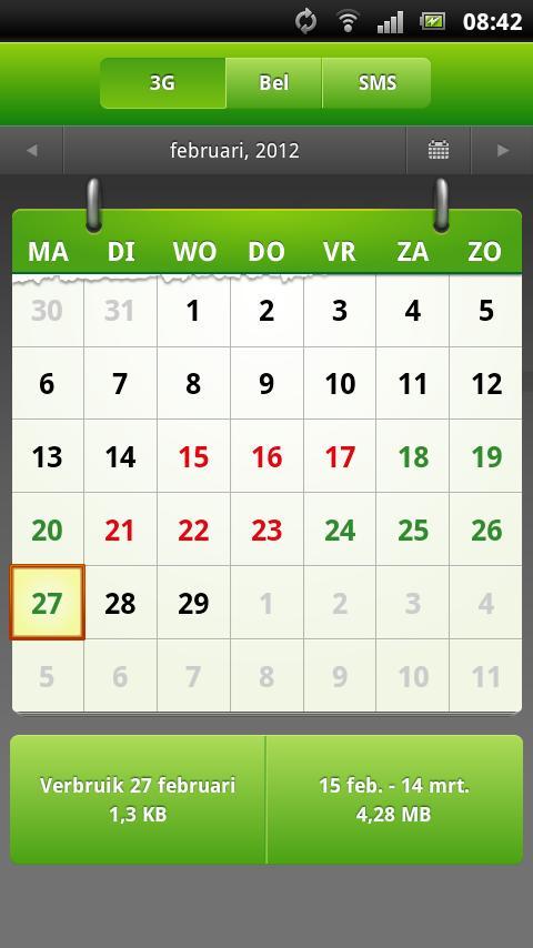 - Veja seu consumo sobre recentemente por dia no calendário. Os dias em que você usou muitos dados móveis são marcados automaticamente em vermelho.