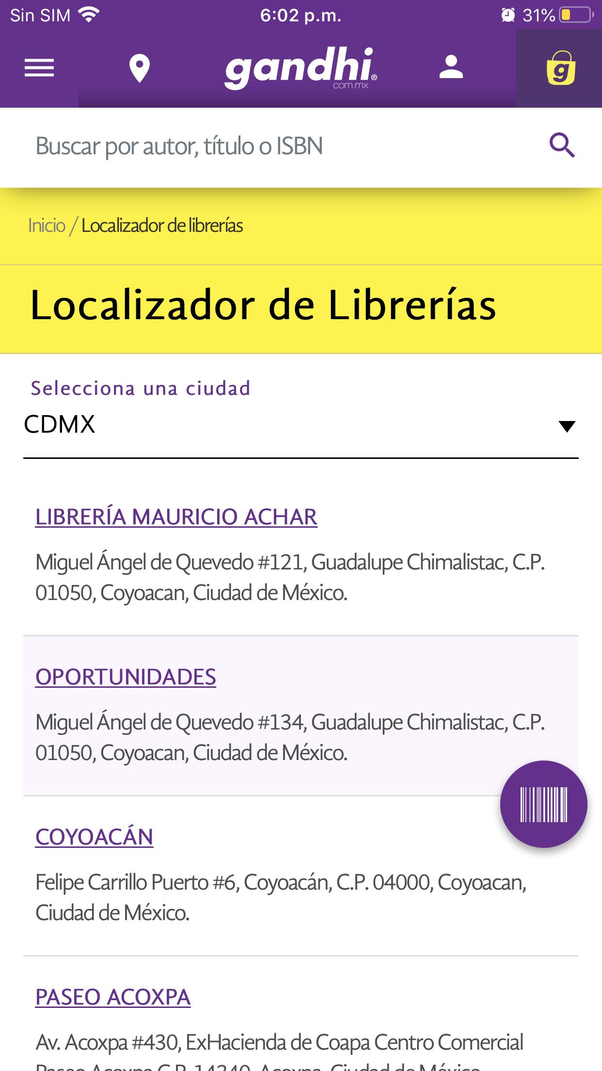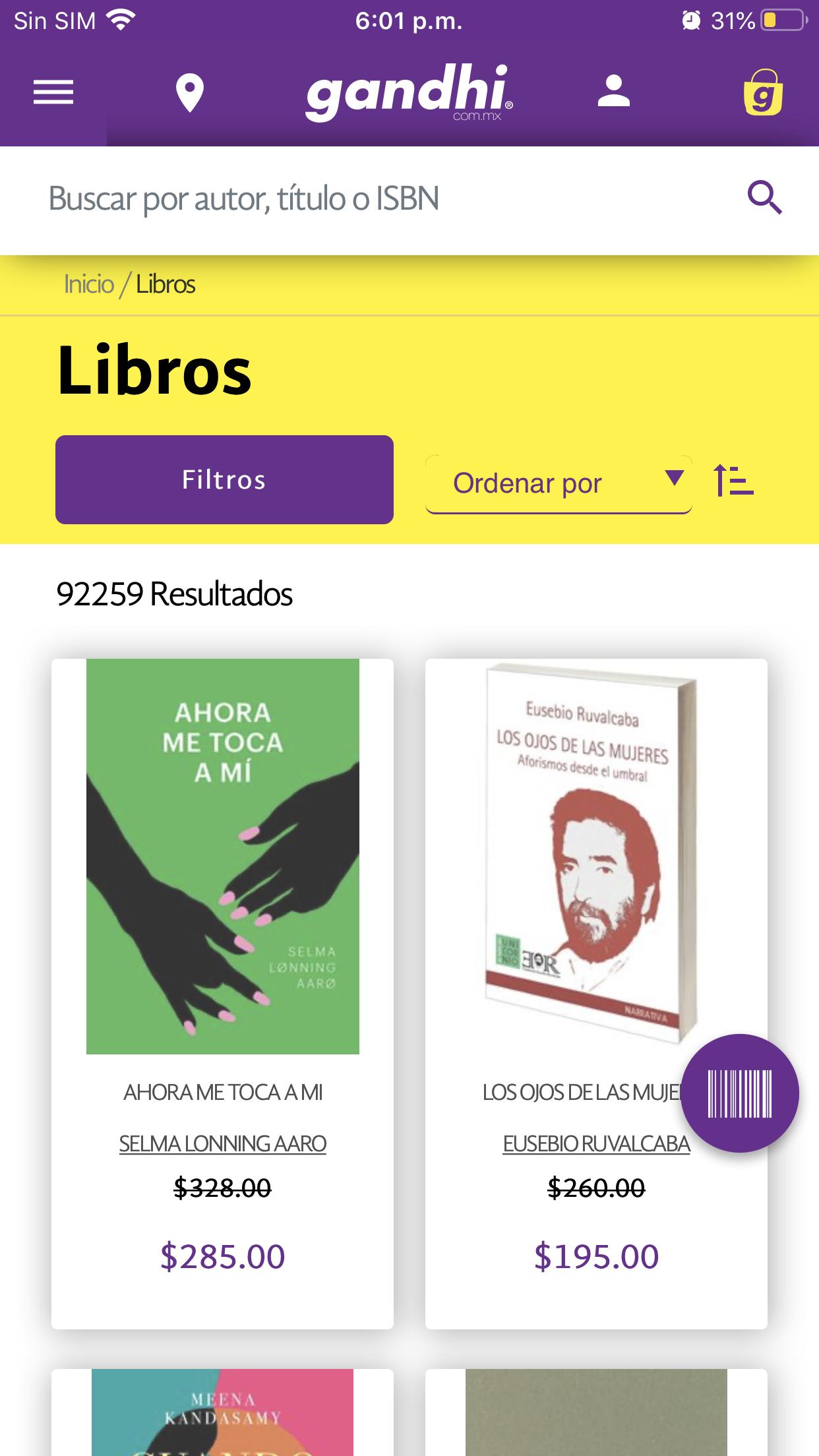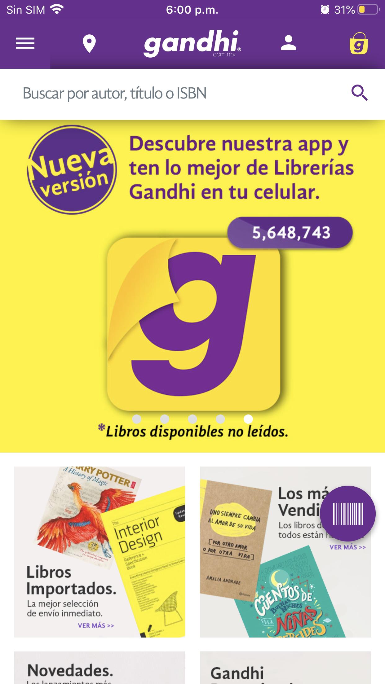 Este é o aplicativo Gandhi Bookstores. Transforme seu dispositivo na melhor livraria do México. Neste aplicativo, você pode comprar livros, acessórios, encontrar suas filiais e manter -se atualizado no mundo dos livros. Este aplicativo foi projetado para que você possa fazer compras, poder monitorar seus pedidos enquanto forem enviados, receber notificações para alterar o status e as ofertas de pedidos, procurar livros por código de barras e muito mais.