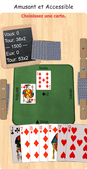 Desenvolvido para se divertir sozinho ou com os amigos, com as variantes suíças francesas 'simples', 'pique duplo' ou o alemão suíço 'unte-ufe' e 'zig-zag'. Se você está sozinho, o parceiro e os oponentes são simulados pelo computador, com uma inteligência artificial eficiente.