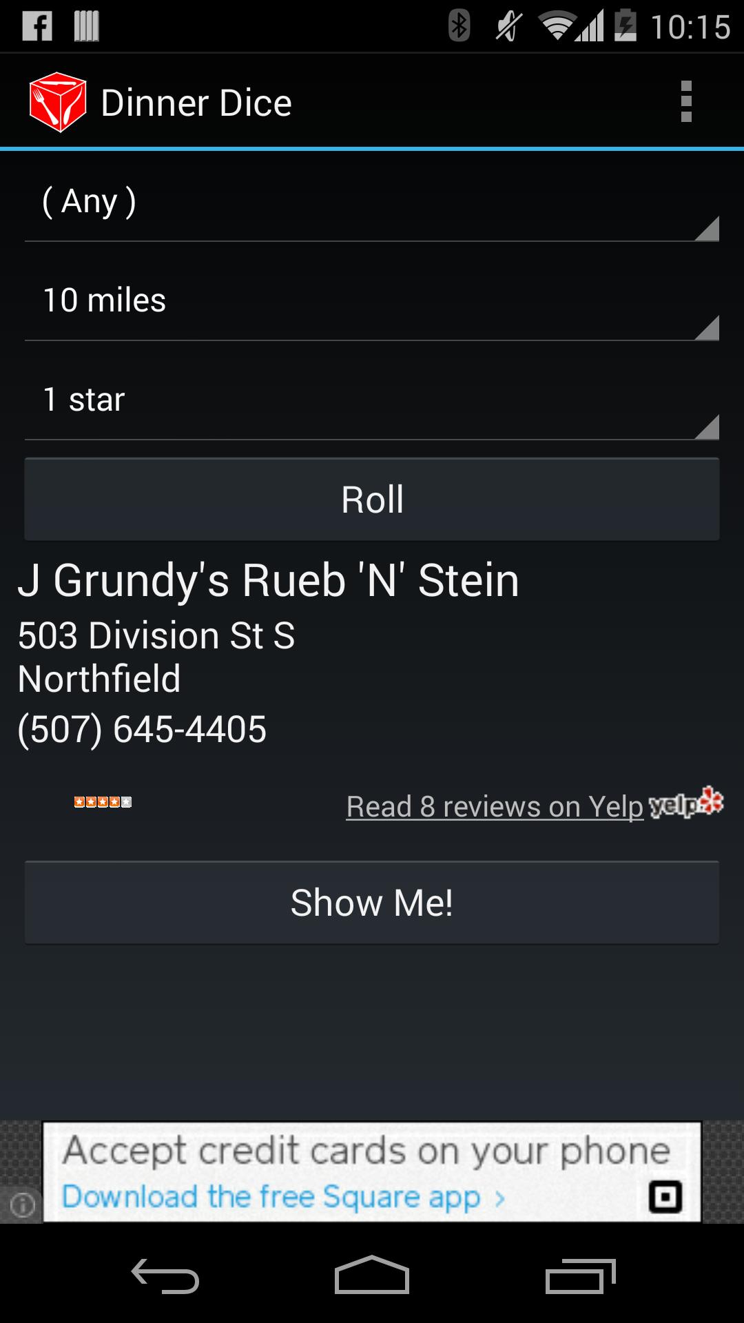 Ну, тогда у нас есть приложение для вас! Просто выберите, какую еду вы хотите, и как далеко вы готовы пойти на это, и казнить Dinner Dice . Мы найдем вам ближайший ресторан, дам вам свой адрес и карту их двери. Вы даже можете перейти, чтобы ваше любимое приложение GPS отвезло вас туда!