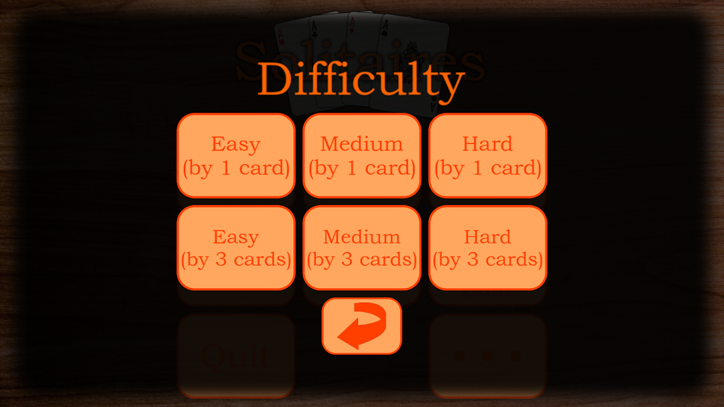 - Clondike Solitaire содержит 3 сложности и 2 типа игры (поворот 1 и поворот 3);