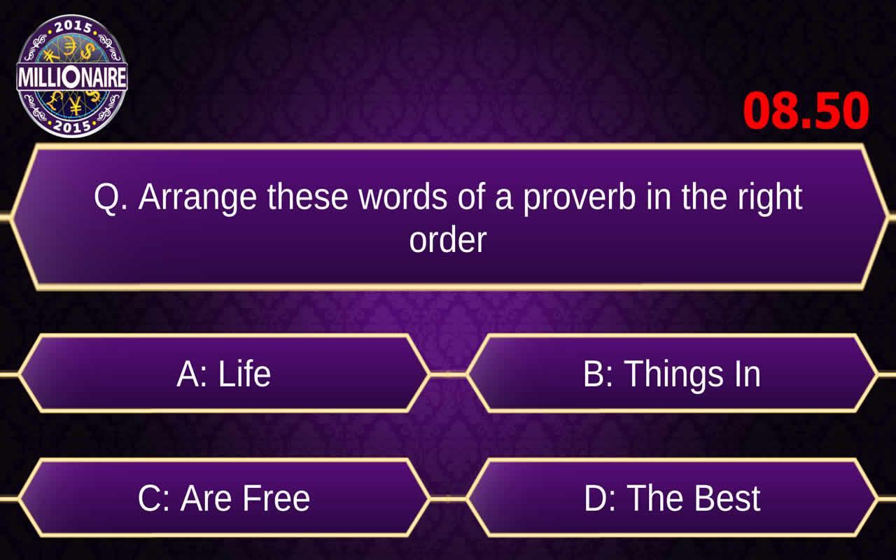 Сначала очистите самый быстрый палец, перечислив ответы в правильном порядке и в кратчайшие сроки. Поздравляю, теперь вы являетесь участником шоу, и это была легкая часть. Теперь ответьте на остальные вопросы и заработайте деньги на каждый вопрос, на который вы отвечаете правильно. Вопросы будут иметь много возможностей и будут основаны на общих знаниях. Ответьте на каждый вопрос, чтобы заработать деньги и перейти в следующий раунд. Однако, если вы отвечаете неправильно, то она закончится, и вам нужно вернуться к началу. Есть четыре варианта, которые помогут вам, если вы не знаете ответ. Это пятьдесят пятьдесят, двойной падение, переверните вопрос и опрос аудитории. Используйте их мудро, так как они доступны только один раз в каждой игре.