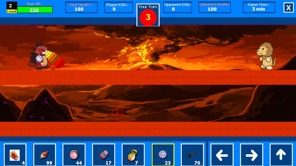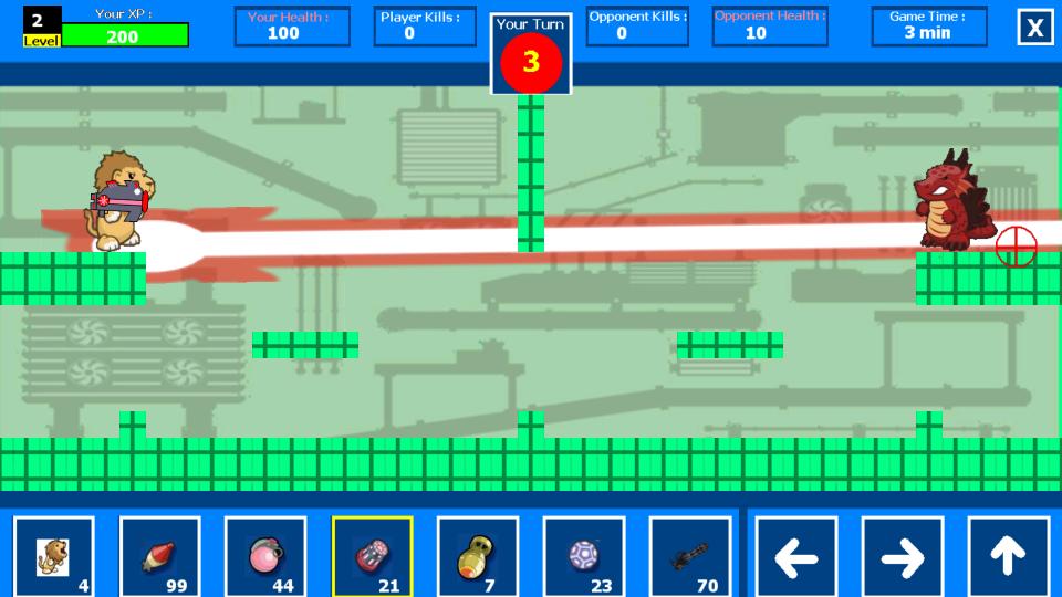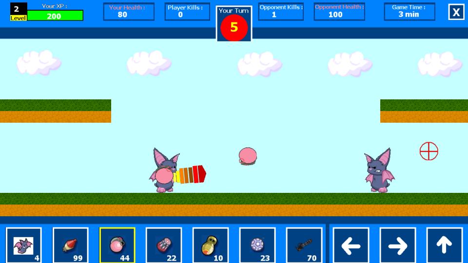 Игра игра основана на поворотах. Вам нужно ждать своей очереди, чтобы играть ... Найдите на значки оружия, чтобы поменяться оружием и нажать на икону «Стрельбы», чтобы стрелять или активировать особую способность питомца (цель использования пальца), битва длиной 3 минуты, а каждый ход - 15 секунд, так что вам лучше использовать свои повороты ... выжимайте больше убийств, чем ваш оппонент, чтобы выиграть в игре, и получить несколько хороших коинд!!