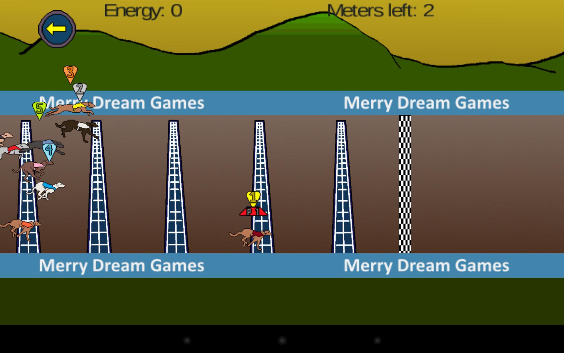 Вы можете гоняться быстрее, просто нажав на экран; Тем не менее, чем быстрее вы идете, тем быстрее вы устали. Найдите хорошую гоночную стратегию, сбалансируя скорость и энергию. Убедитесь, что у вас достаточно энергии, чтобы закончить гонку собак.