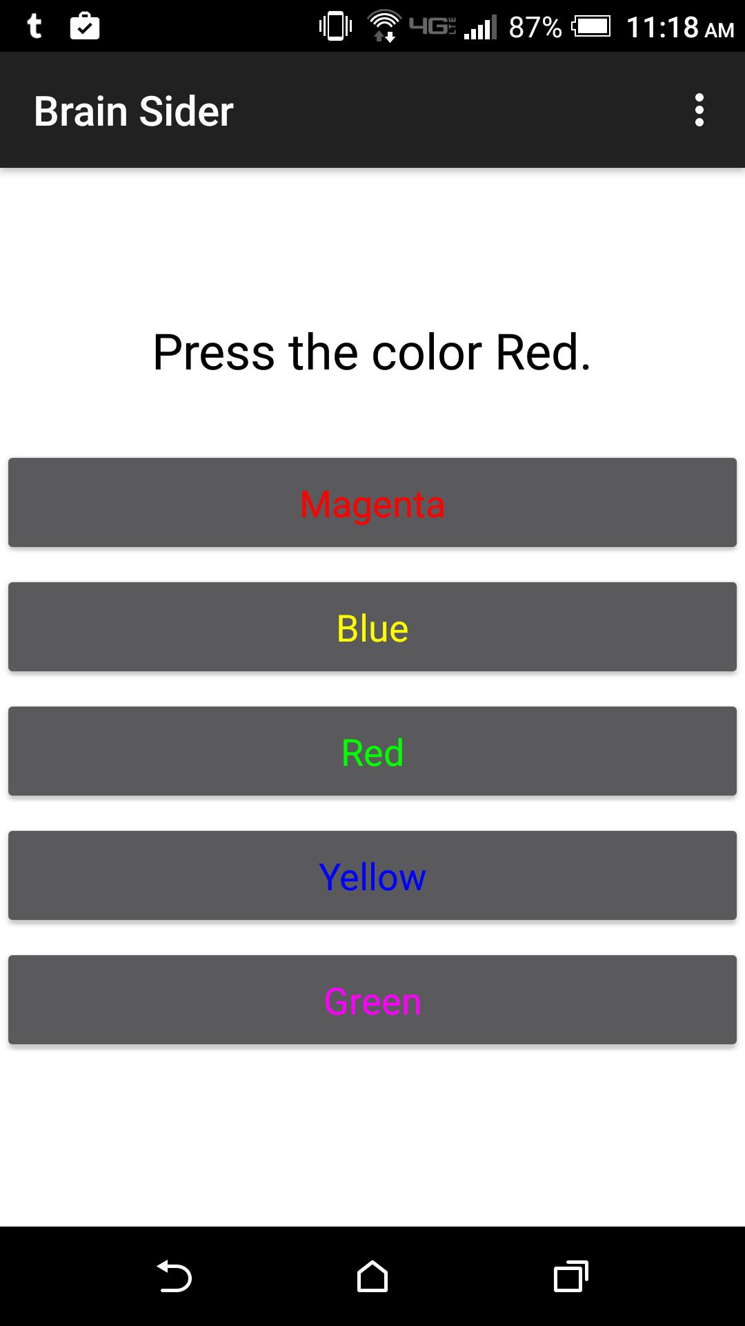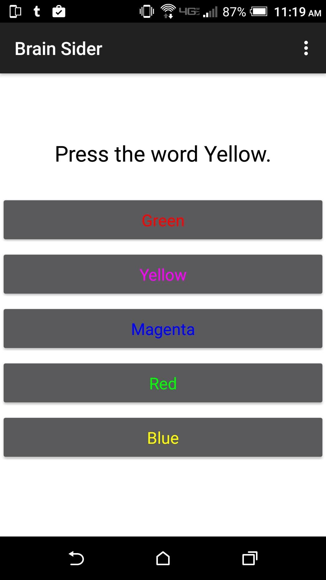 Brain Sider - это игра, которая задает вам ряд вопросов, а затем дает вам отзывы на основе ваших ответов. Исследования показывают, что правая сторона мозга запускает творческое мышление, а левая сторона мозга вызывает логическое мышление. В Brain Sider якобы цвет запустит правую сторону вашего мозга, а слово предположительно запустит левую сторону вашего мозга.