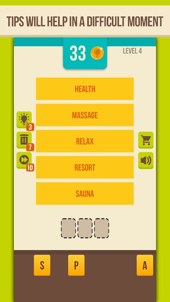 Игра в Association Word Game предоставляет вам интересный способ сгибать ваш мозг. Угадайте слово 5 ассоциаций, открывая их один за другим. Чем меньше ассоциаций вы откроете, тем больше монет вы заработаете, поскольку каждая неоткрытая ассоциация - это монета, которая будет добавлена в ваш кошелек. Есть три совета, которые помогут вам в трудных ситуациях.