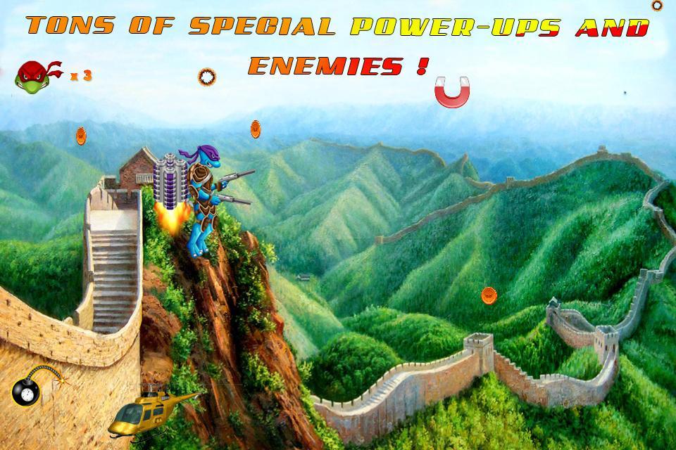 ง่ายและสนุกมาก: ควบคุมเต่าคาวบอยเจ็ทแพ็คของคุณด้วยนิ้วมือของคุณและทำให้เขาหลีกเลี่ยงและยิงเพื่อทำลายศัตรูนินจา ปลดล็อกเต่า Cowboys ที่แตกต่างกันในขณะที่คุณทำระดับให้สำเร็จ! แก๊งนินจาได้ตัดสินใจที่จะบุกทุกประเทศหลักในโลก!