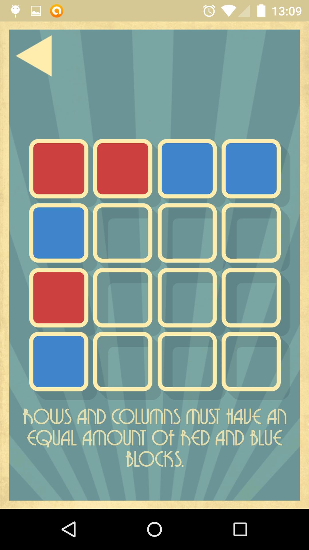 2. ทุกแถวและคอลัมน์จะต้องมีบล็อกสีแดงและสีน้ำเงินเท่ากัน