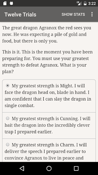 " The Twelve Trials " เป็นนวนิยายแฟนตาซีอินเทอร์แอคทีฟ 160,000 คำโดย Douglas Dicicco และได้รับรางวัลอันดับสามในการแข่งขันทางเลือกของการแข่งขันเกมสำหรับนวนิยายอินเทอร์แอคทีฟ มันเป็นข้อความทั้งหมด-โดยไม่มีกราฟิกหรือเอฟเฟกต์เสียง-และเติมพลังด้วยพลังอันกว้างใหญ่และไม่สามารถหยุดยั้งของจินตนาการของคุณได้