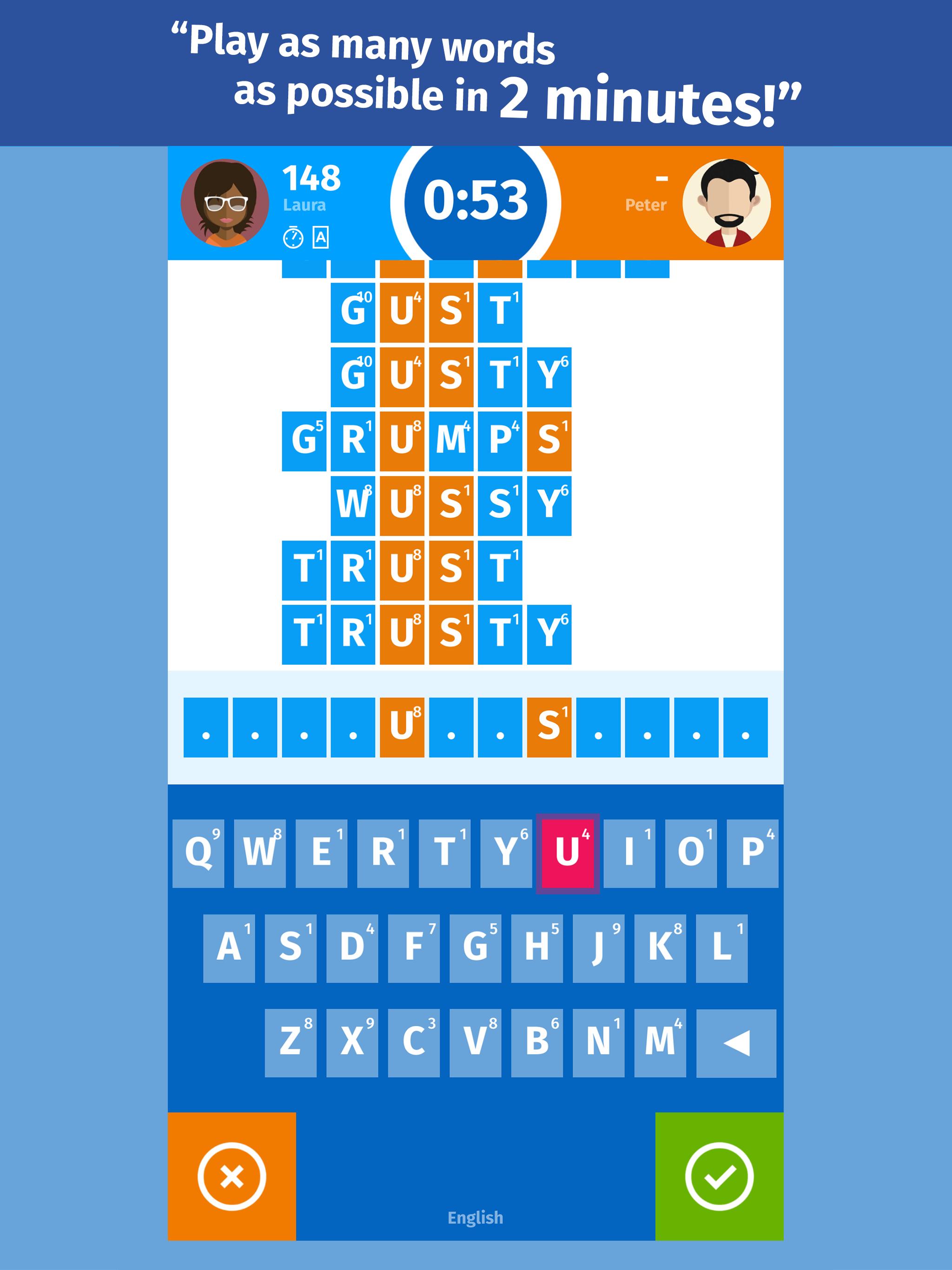 เล่นกับเพื่อนครอบครัวและคู่ต่อสู้แบบสุ่ม ผู้เล่นที่ชนะ 3 รอบก่อนเป็นผู้ชนะของการแข่งขัน นอกจากนี้คุณยังสามารถใช้ boosters เช่นค่าคำสองคำเพื่อให้คะแนนของคุณที่เพิ่มขึ้นเล็กน้อยเพื่อชนะ!