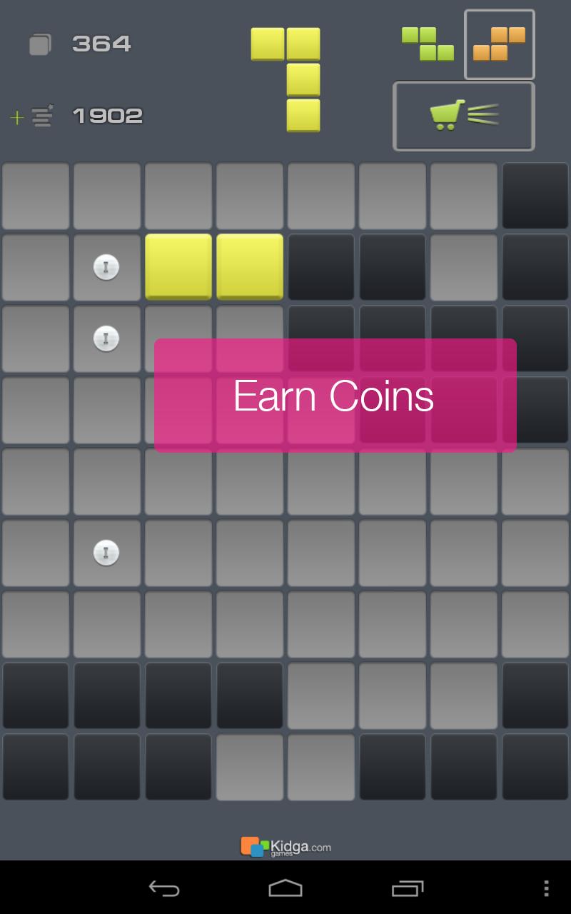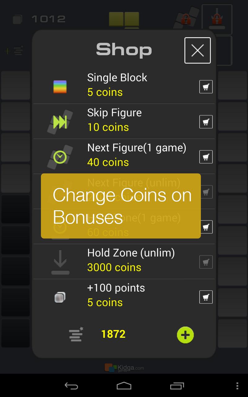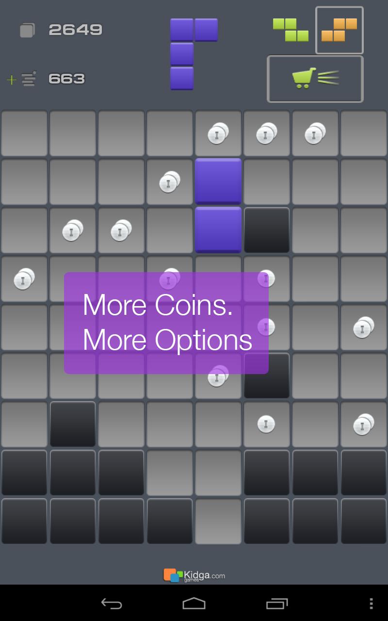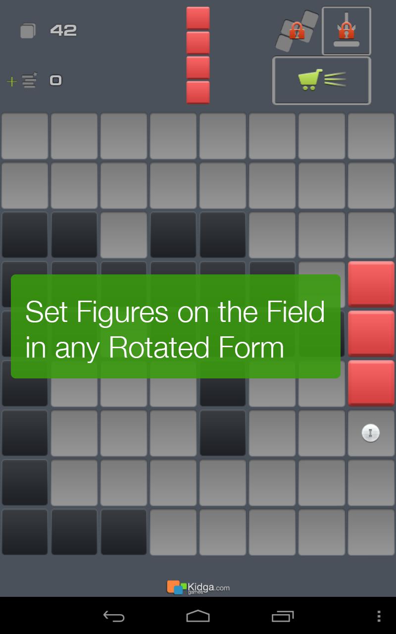 选择所示图形形状(任何旋转版本)的砖块将其从字段中删除。清除行以使新砖可用。收集硬币,EANR硬币并购买奖金以增加游戏体验并创造新的记录。