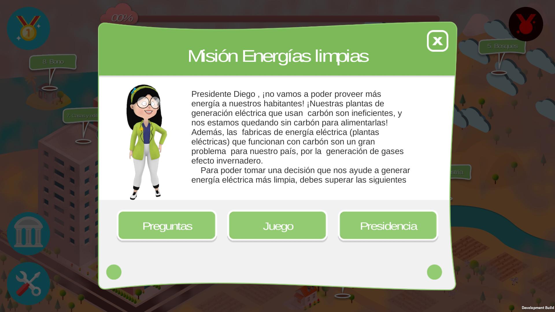 目的是,玩家占据了决策者( Mi Colombia 2050总裁)的角色,以降低其国家的温室气体排放水平。这是通过获得信贷(货币)来实现的,以积累投资预算,以实施经济不同部门(运输,住房,废物,农业和牲畜,林业等)的缓解措施。