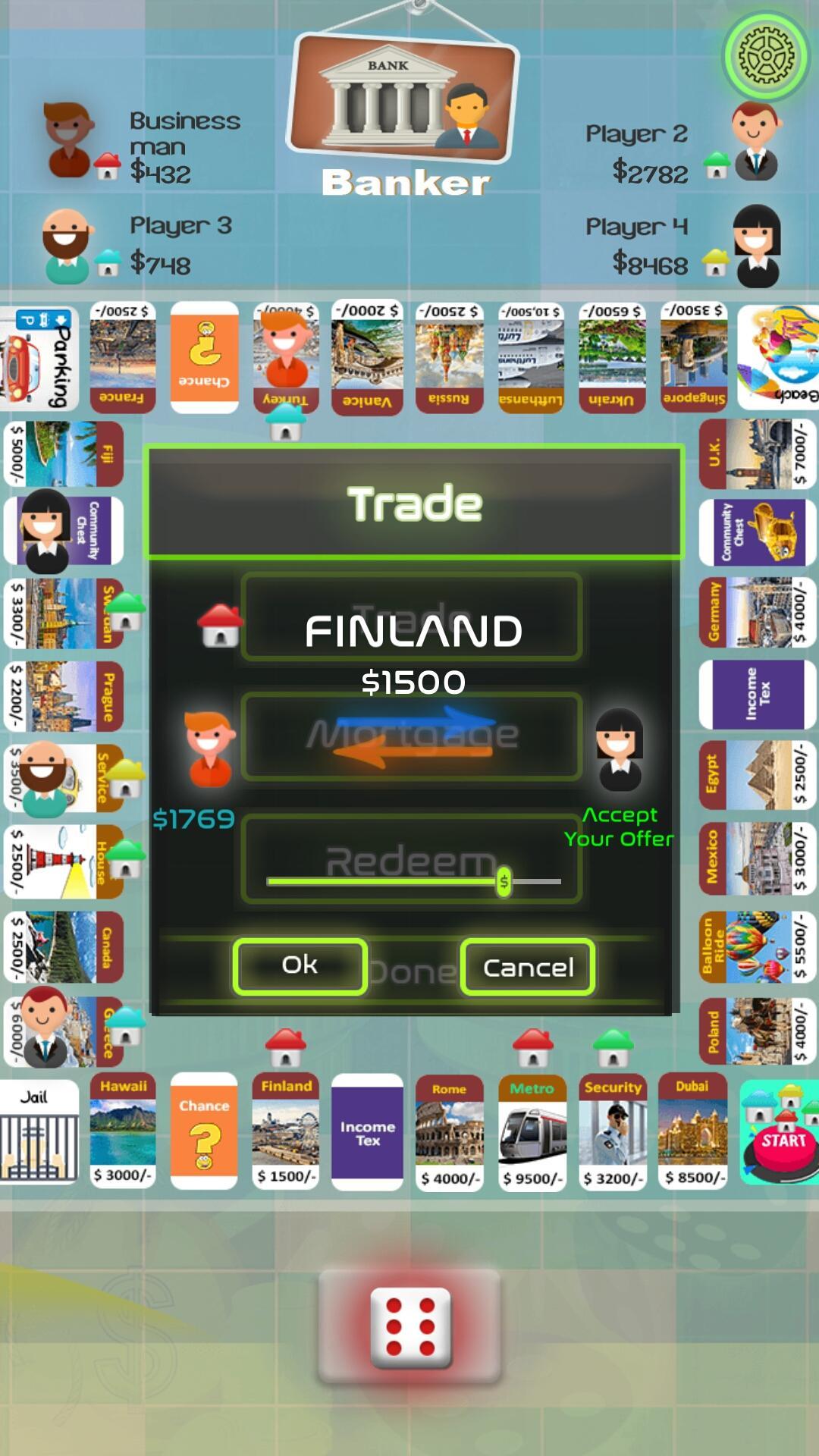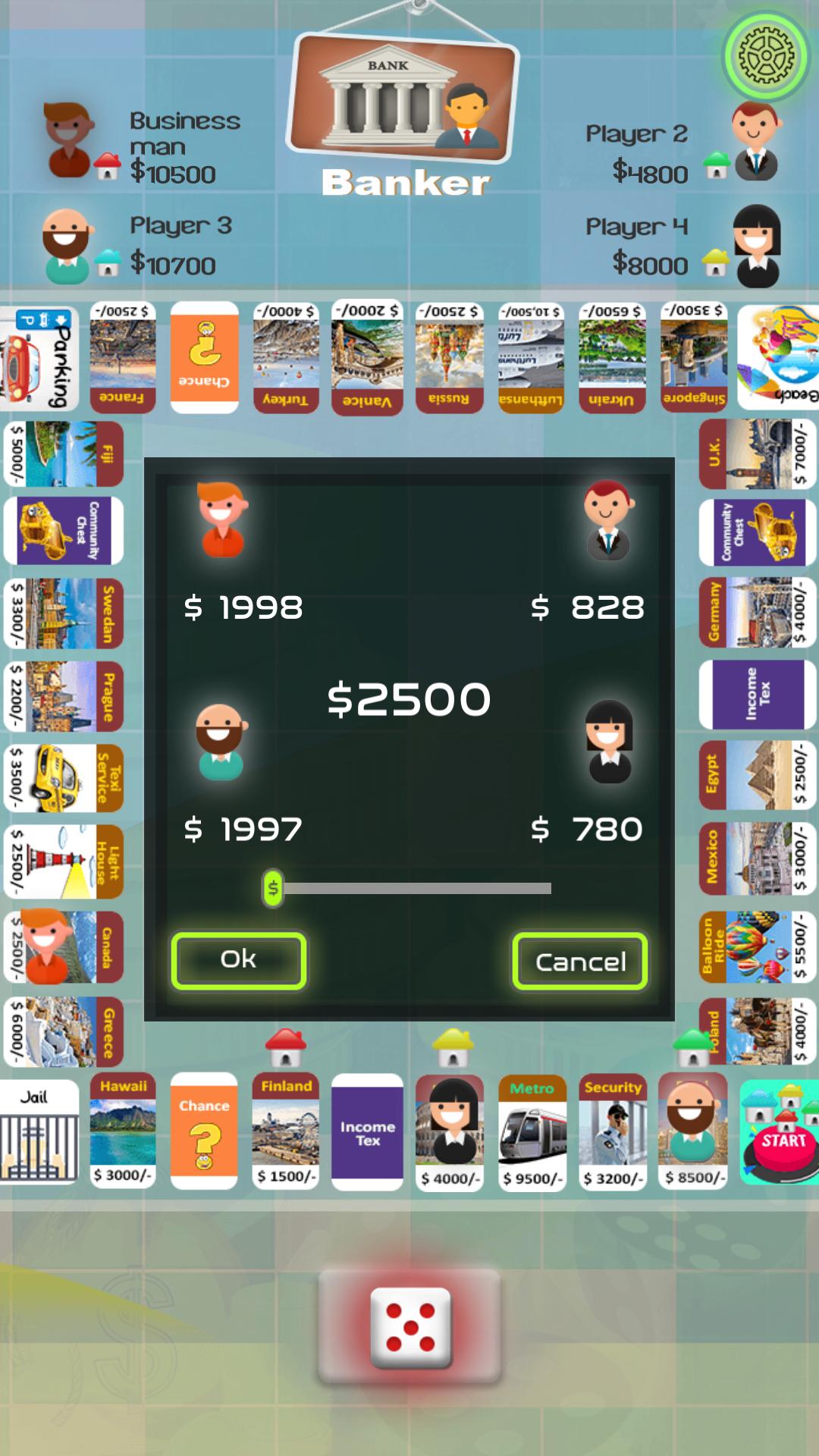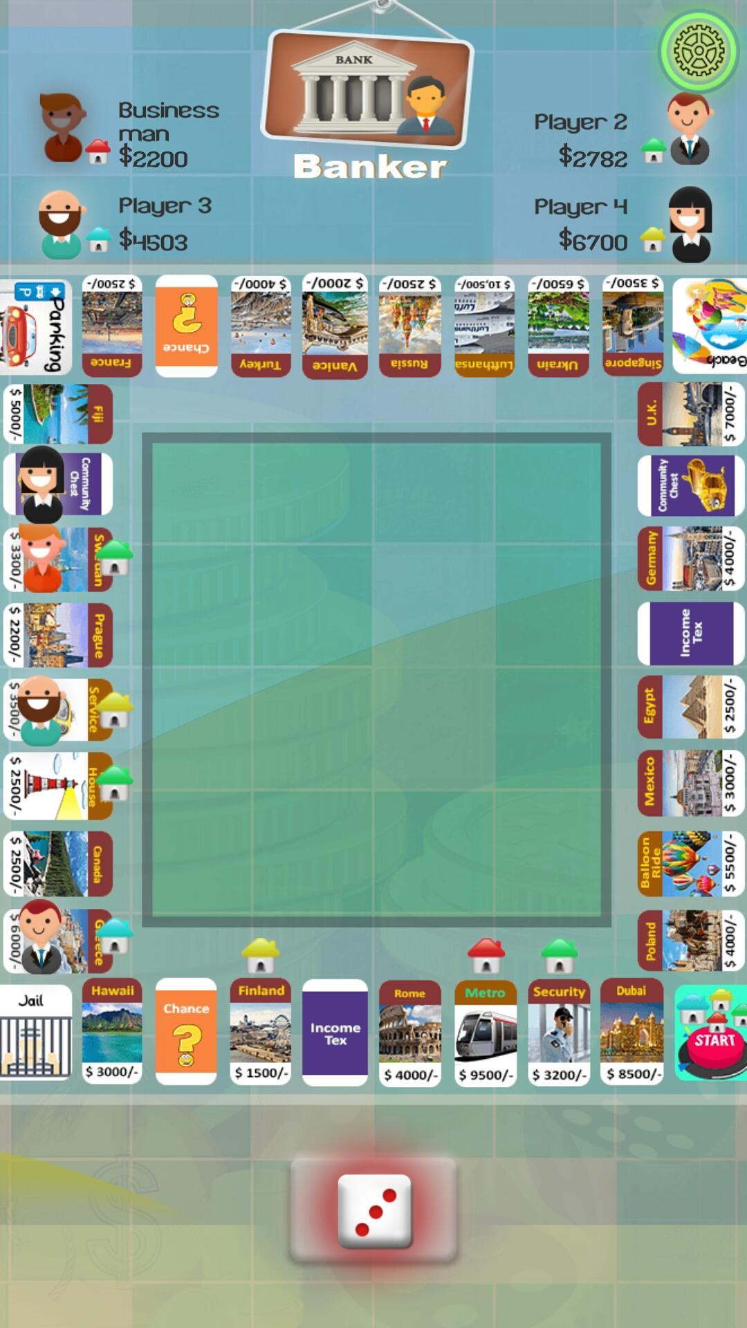 板的設計旨在完美適合您的手機或平板電腦。廣場包括城市和機場,高速公路,渡輪,賭場卡,彩票和監獄。地板上的玩家將兩個骰子投擲,並在板上順時針旋轉。降落或通過開始廣場收集基金的球員。如果玩家翻了一番,他們可以依次滾動。在連續三組雙打之後,她必須入獄。