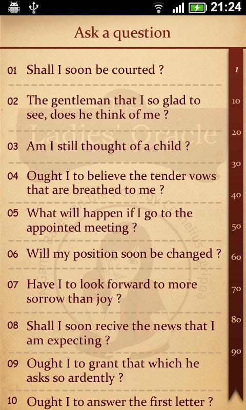 “我想的人,他愛我嗎?” “我嫁給年輕嗎?” “我愛的人,他忠於我嗎?”女士們的甲骨文是一款聰明的小遊戲,對任何提出的問題都沒有令人滿意的結果回答。